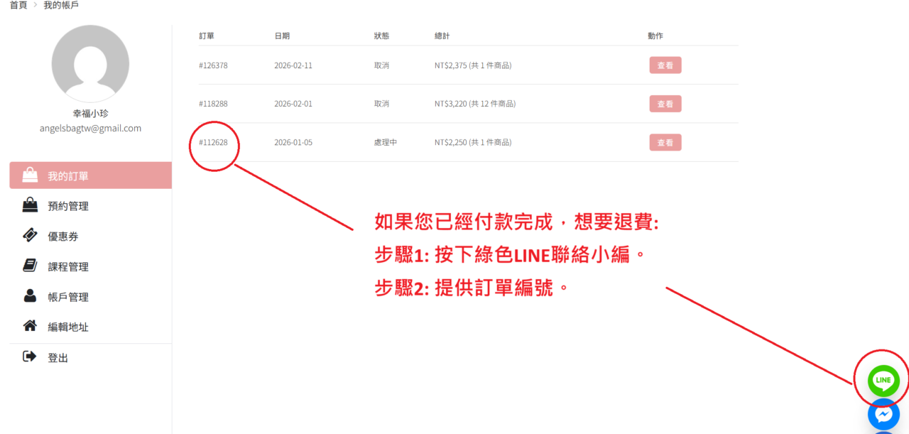 當你已經付款,但是尚未開始上課,想要取消這筆訂單時,透過下列步驟,可以協助您退款事宜。